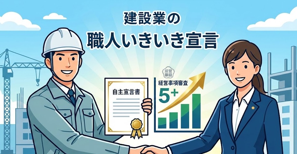 建設業界では深刻な人手不足が続く中、技能者の処遇改善が急務となっています。こうした背景から、令和8年より経営事項審査(経審)において新しい加点項目「建設技能者を大切にする企業の自主宣言制度(職人いきいき宣言)」が導入されることとなりました。W点で5点、P点に換算すると約6.5点のアップが見込める項目です。